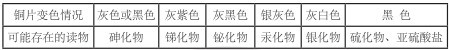 取樣品 5g 于三角燒瓶或蒸發(fā)皿中,加入 25ml 蒸餾水或純凈水,加入 5ml 鹽酸(如為水樣,取樣品 25ml,加鹽酸 5ml 即可),加入約 0.5g 氯化亞錫晶粒,將三角燒瓶放在電熱板上,調(diào)節(jié)溫控旋鈕使樣液微沸約 10 分鐘(驅(qū)除硫化物的干擾),此時(shí)加入 2 片銅片,保持微沸約 20 分鐘。注意隨時(shí)補(bǔ)加熱水,保持體積不變。若加熱 30 分鐘后銅片表面未變色,可否定砷、汞的存在,如銅片變色,可按下表推測(cè)樣品中可能存在的化合物,并可采取相應(yīng)措施加以處理。保留陽(yáng)性樣品,有條件時(shí)分別加以確證。