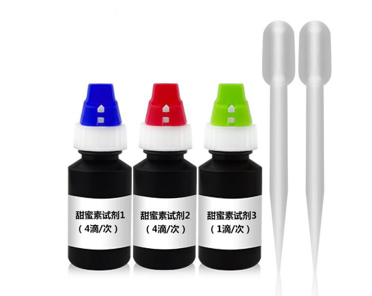 吸取 0.5ml 樣品于 10ml 比色管中,加入 1.5ml 蒸餾水(或純凈水),加入 4滴甜蜜素檢測(cè)試劑1、4滴甜蜜素檢測(cè)試劑2,搖勻比色管中的溶液,靜置片刻,接著滴加 1 滴甜蜜素檢測(cè)試劑 3,滴加后立即搖動(dòng) 1 分鐘,在搖動(dòng)的過程中將蓋上蓋子,放置2分鐘,搖勻后觀察溶液的渾濁度,與檢測(cè)色階卡進(jìn)行比較,即可得到甜蜜素含量。