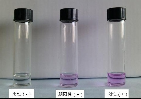 2min 內觀察顏色變化,若溶液出現粉紅至紫紅色,則判為陽性(+);無色判為陰性(-)。